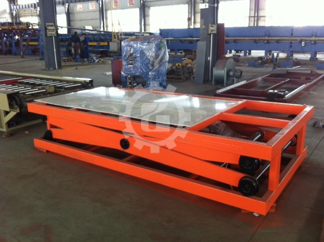將成型后的板材裝到升降臺(tái)上,減少了用工量,降低了人為對(duì)板材及托板的損壞