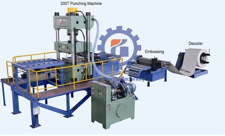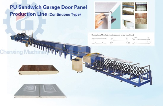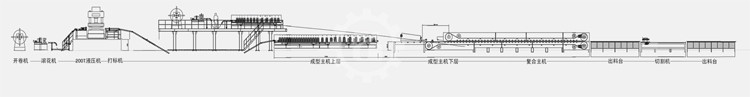 開卷——壓花——沖方框——冷彎成型機——聚氨酯注射發(fā)泡——車庫門復(fù)合主機——出料自動跟蹤切斷機——出料臺