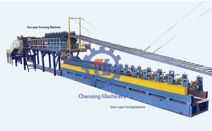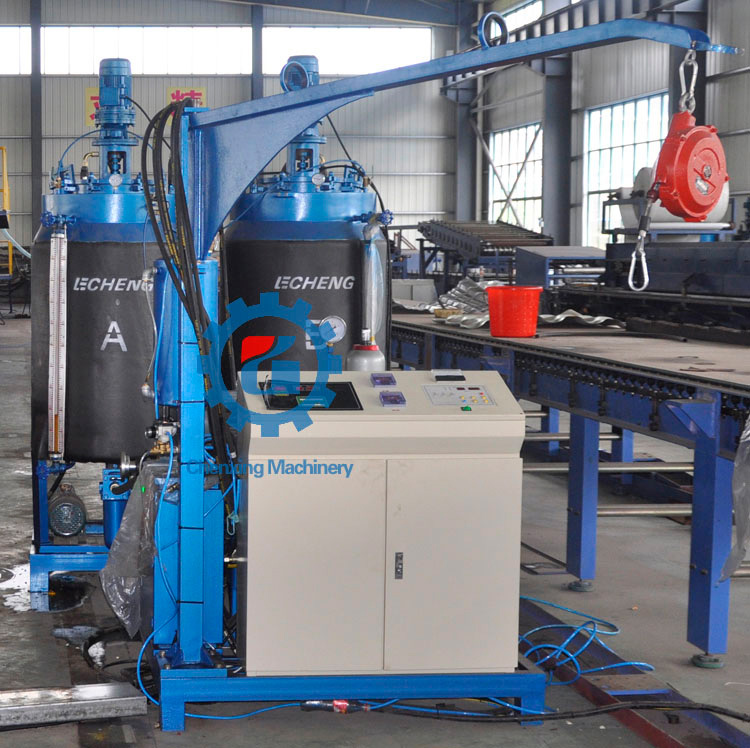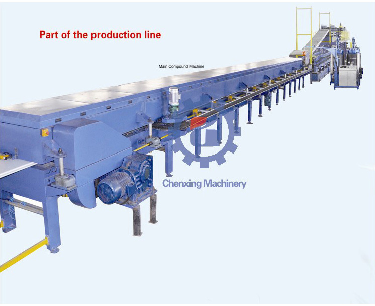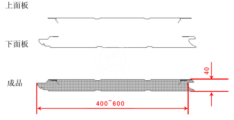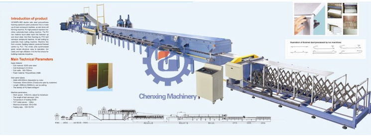 HCWMPU-600 雙層彩鋼聚氨酯發(fā)泡復(fù)合車庫門板生產(chǎn)線是由以下設(shè)備組成:復(fù)合主機,上下層車庫門板冷彎壓型機,高壓聚氨酯發(fā)泡機,自動跟蹤切斷機。其中聚氨酯原料是以A&B料液體形式注入到上下層彩鋼板中,通過特種材料PVC橡膠帶傳輸發(fā)泡,最后出板由PLC微電腦控制進行跟蹤切斷。從鋼卷開卷進料、壓花、沖型、冷彎成型、聚氨酯原料注射、發(fā)泡成型、自動跟蹤切斷均為PLC自動控制,連續(xù)生產(chǎn)。